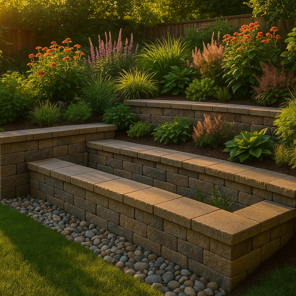 Retaining walls get drain stone, perforated pipe to daylight, and geogrid per block specs. Walls over about 4' may require permits or engineering; we help coordinate that when needed.